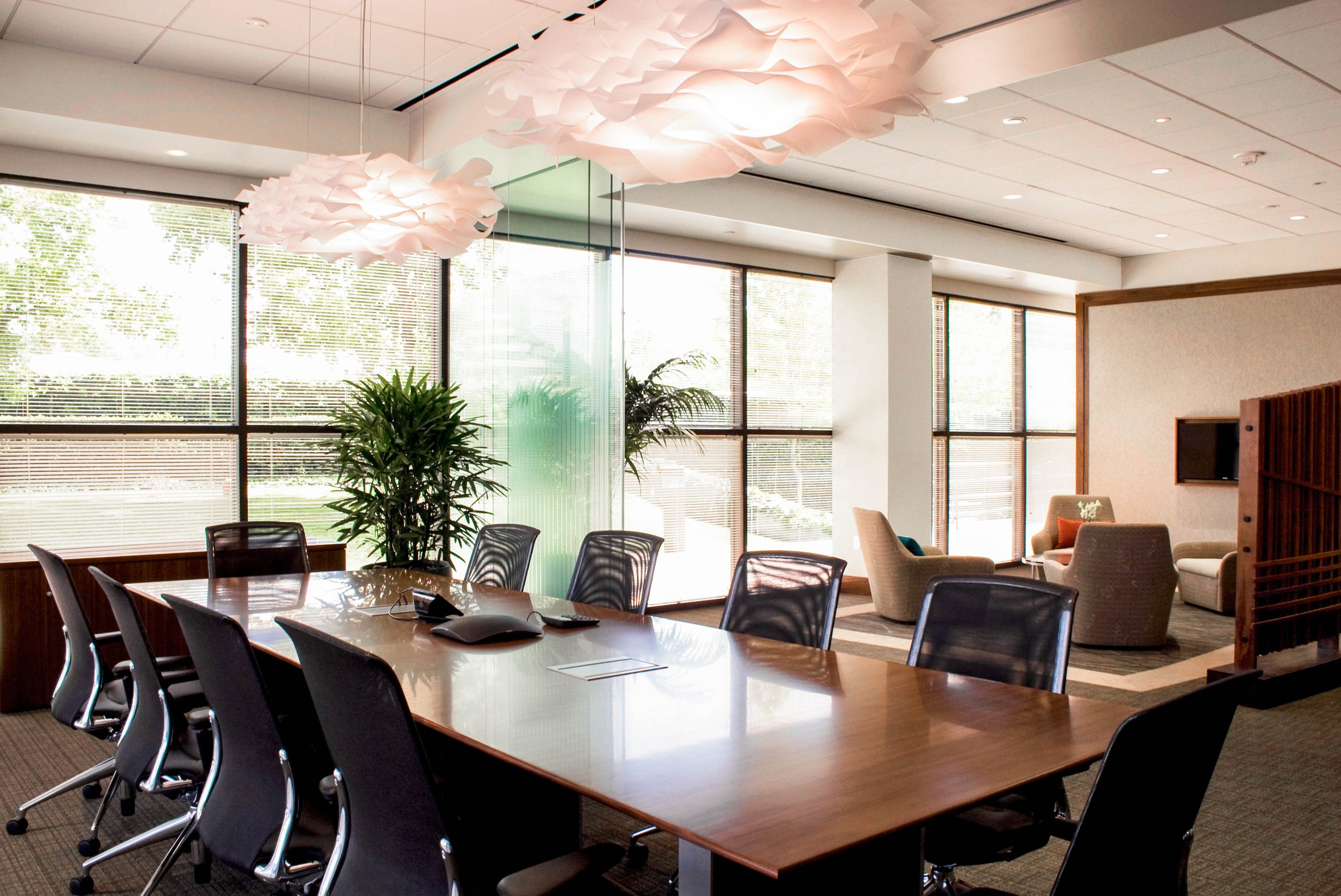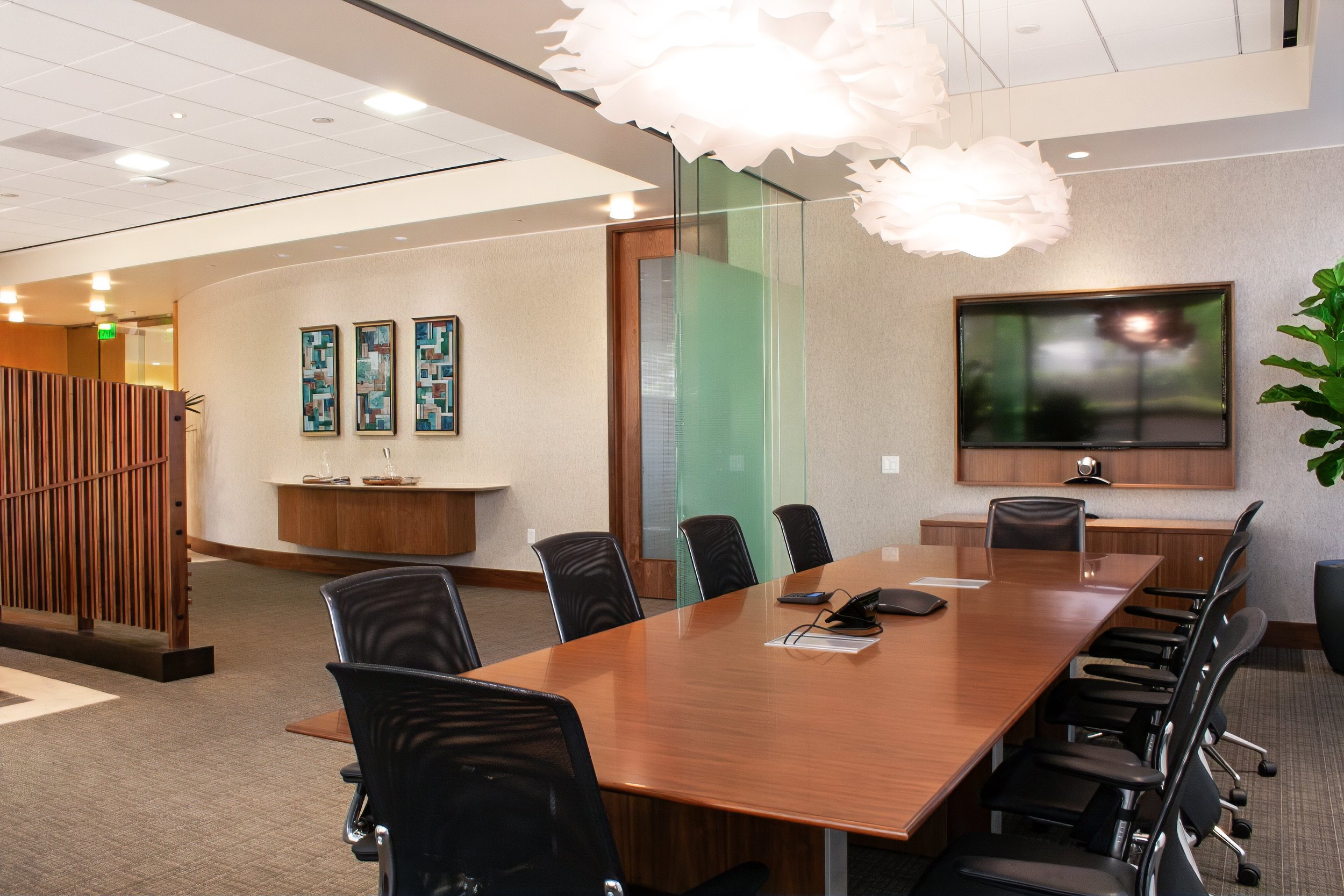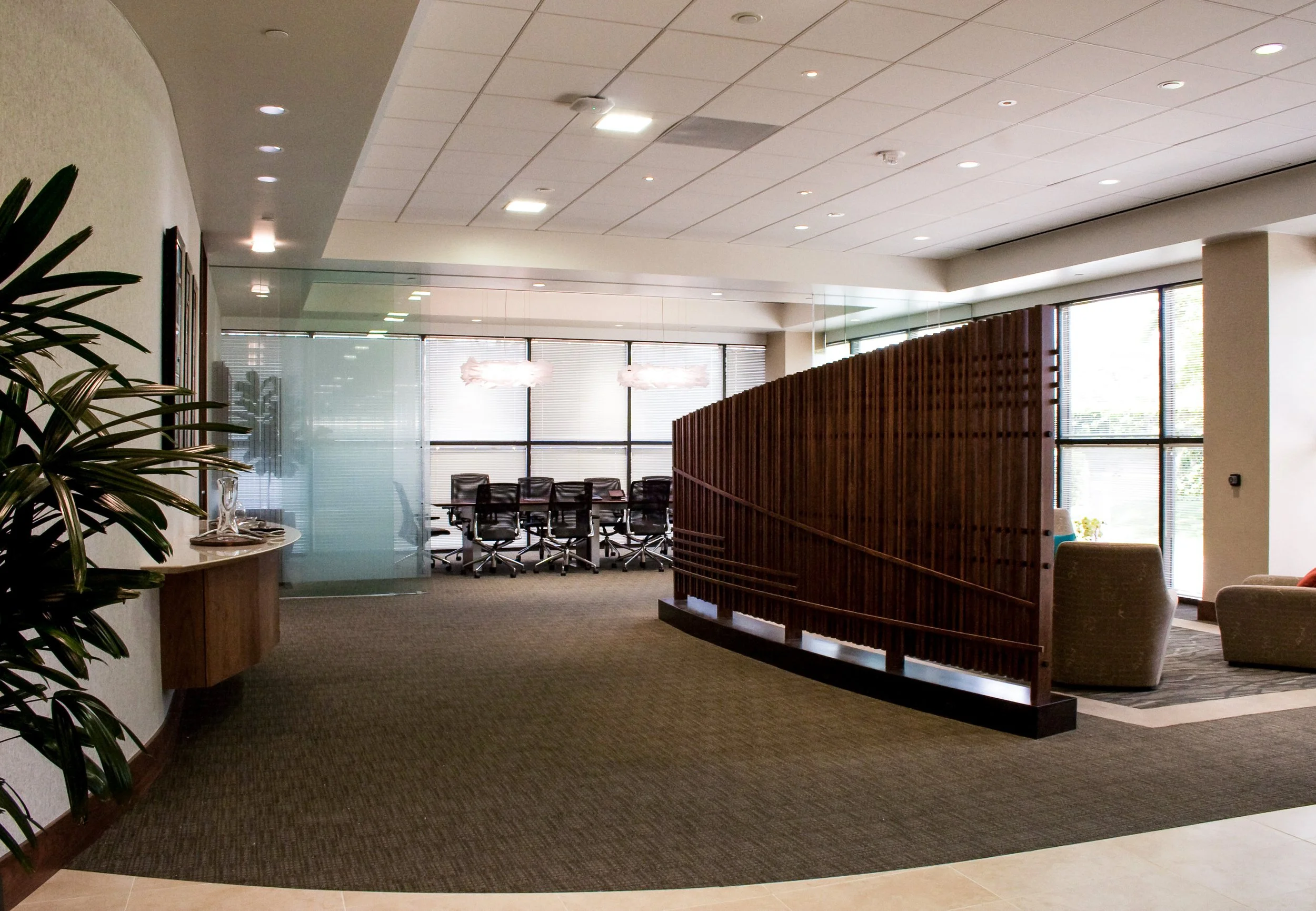 The scope includes a new wealth management lobby, conference room, meeting room, private offices, open office area, hoteling room, copy/storage space, janitor’s closet, and upgraded men’s and women’s restrooms. The layout was organized to provide privacy, clarity of circulation, and a refined environment appropriate for high-level client engagement.
